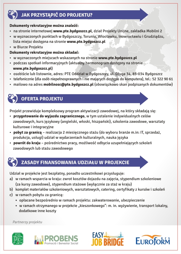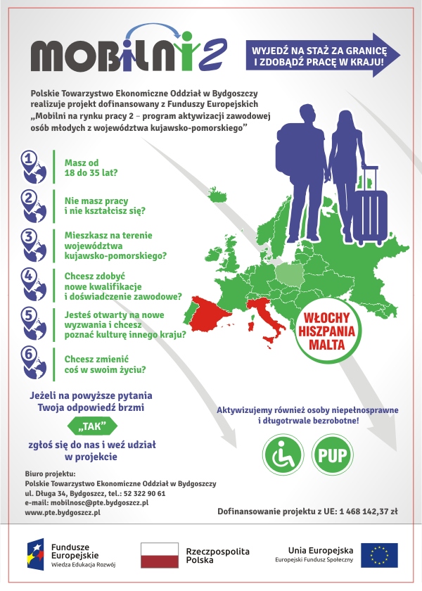 Zapraszamy do udziału w spotkaniu informacyjno-rekrutacyjnym projektu Mobilni na rynku pracy 2. Projekt jest w pełni finansowany z funduszy unijnych. Jest on skierowany do osób w wieku 18-35 lat, które nie uczą się ani nie pracują, w tym również długotrwale bezrobotnych i niepełnosprawnych. Uczestnicy wyjeżdżają na dwumiesięczne staże zawodowe za granicę (do Włoch, Hiszpanii, na Maltę). Przed wyjazdem wezmą oni udział w szkoleniach przygotowawczych (zawodowe, językowe), zaś w czasie pobytu za granicą będą kontynuować naukę języka oraz zwiedzać kraj pobytu. Po zakończeniu stażu pomagamy uczestnikom odnaleźć się na rynku pracy. Obecnie rekrutujemy chętnych do udziału w stażu we Włoszech.